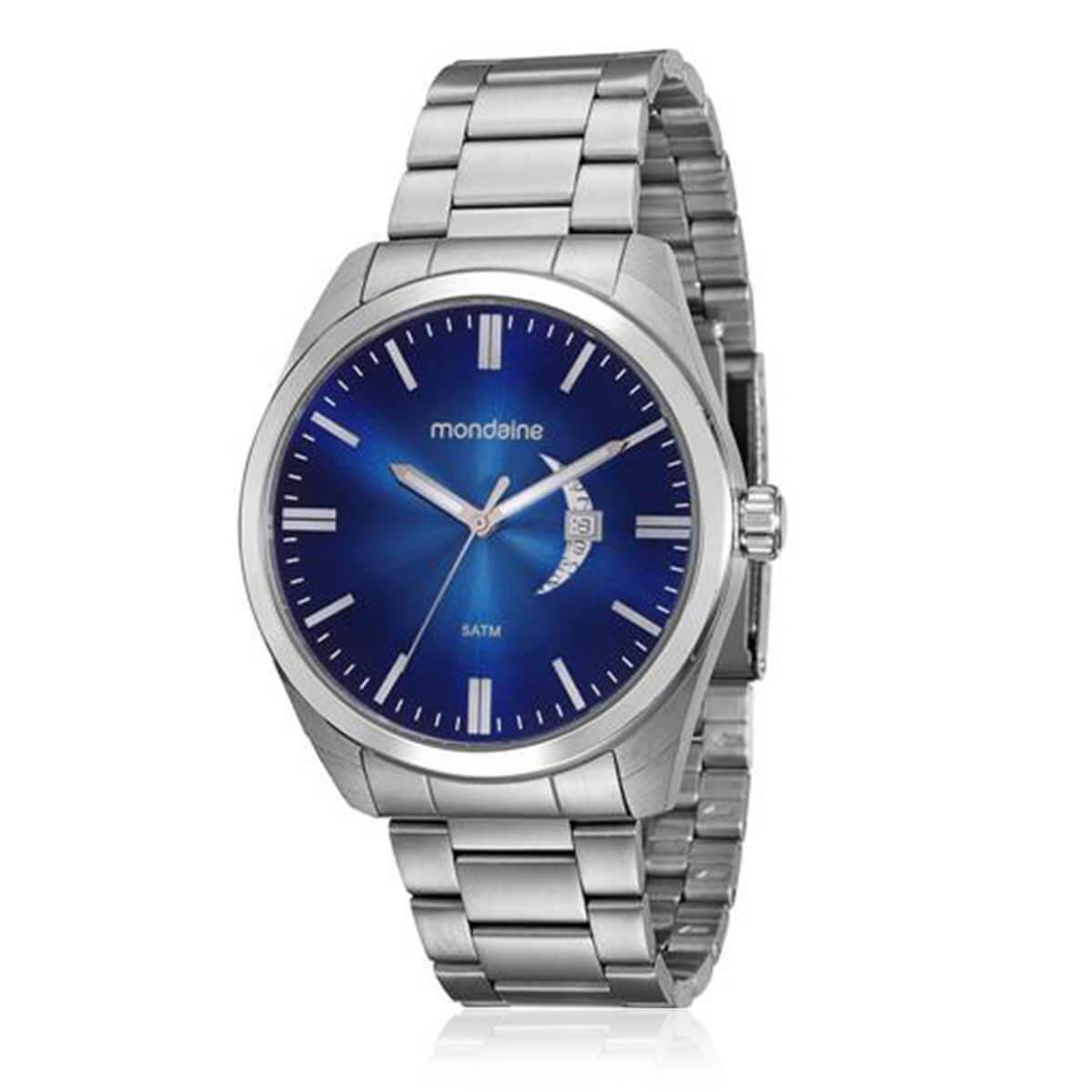 Relógio Masculino Mondaine 99001G0MVNA1 Caixa: Aço inoxidável Pulseira: Aço inoxidável Mostrador: Azul Função: Calendário Resistência: 5 ATM Visor em Cristal mineral Movimento Quartz Tamanho da Caixa: 47 mm Espessura da Caixa: 11 mm Tamanho da Pulseira: 24 cm Fecho Dobrável com trava Estado: Novo Acompanha caixa e manual.