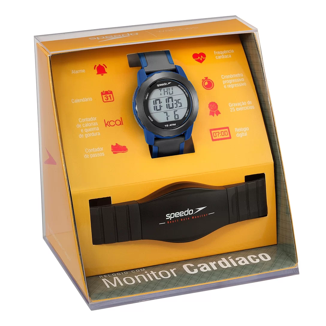 REL PULSO SPEEDO MONITOR CARDÍACO 80622G0EVNP1 Vídeo com review do relógio: https://www.youtube.com/watch?v=SppkFwWPAGI Com cinta cardíaca, o Relógio Com Monitor Cardíaco Digital Speedo 80622G0EVNP1 é a pedida certa para auxiliar seus treinos de corrida diários. Acompanhe a evolução do seu desempenho no esporte. Nome: Relógio Com Monitor Cardíaco Digital Speedo 80622G0EVNP1 Gênero: Unissex Indicado para: Dia a Dia Tipo: Smartwatch Funções: Gravação de 25 exercícios, Alarme, Calendário, Cronômetro progressivo e regressivo, Relógio, Contador de Passos Resistencia a Agua: 10 ATM Tipo de Relógio: Digital Transmissão de FC: Cinta Composição: Caixa: Policarbonato. Pulseira: Poliuretano Luz de Fundo: Sim Memória: Memória de Treinos Percentual de Gordura: Sim Garantia do Fabricante: 12 meses - contra defeito de fabricação SAC: atendimento.cliente@seculus.com.br Cálculo de Calorias: Com Cálculo de Calorias Itens Inclusos: Relógio, Cinta para Frequência Cardíaca Origem: Nacional Marca: Speedo