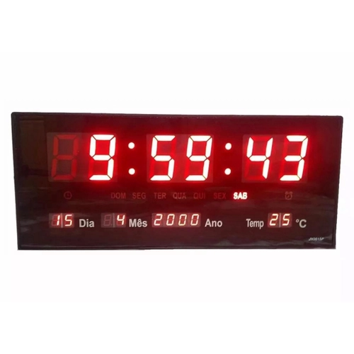 Relógio Digital - Termômetro - Calendário com Led. Tamanho grande Led vermelho. Visualização a distância. Exibição, minutos, ano, mês, data, temperatura hora. Quatro botões na parte traseira para definir a hora e data. Ele também tem um despertador. Memória embutida para uma falha de energia para manter os dados. Construção de plástico. Adaptador de operação 110- 220V ac - 5V 500mAh Apropriado para lojas, Igrejas, cafés, escritório, Ideal para Consultórios, Academias, Residências e Comercio em geral. O Relógio Led Digital de parede é ideal para escritórios, empresas, centros esportivos, academias, clubes, entre outros. Produto de fácil instalação, design moderno e com sistema de ajuste simples. Possui calendário automático, termômetro e alarme com música. Especificações técnicas: Alarme - Relógio, Modo 12 ou 24h com calendário e sensor temperatura incluso - Gabinete em plastico resistente muito leve e design compacto na cor preta; - Displays com alta performance para visualização em ambientes internos; - Cores do Display: Vermelho. - Botões laterais para controle e acesso do equipamento; - Visualização: até 30m. - Uso interno. - bivolt: 110 ou 220V automático Fácil visualização à distância Características: - Excelente Nitidez - Temperatura - Hora - Dia, Mês e Ano. - Alarme até 4 programações - Calendário - Dia da semana em português - Números grandes de fácil visualização 5,5 x 3,5 cm. - Fácil ajuste. - Fácil Instalação. - Sistema eletrônico de Quartz, não atrasa nem adianta. - Não perde a memória quanto acaba a energia. Dimensões: Largura: 46cm Altura: 15 cm Profundidade: 3 cm Cores disponíveis Preto com Led Vermelho Peso: 1010g Itens incluídos: 1 - Relógio 36 x 15x 3 cm Preto com Led Vermelho 1 - Cabo 1.10 Cm 1 - Fonte Bivolt