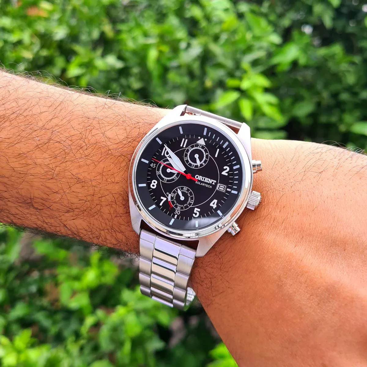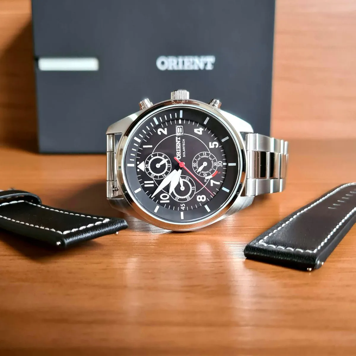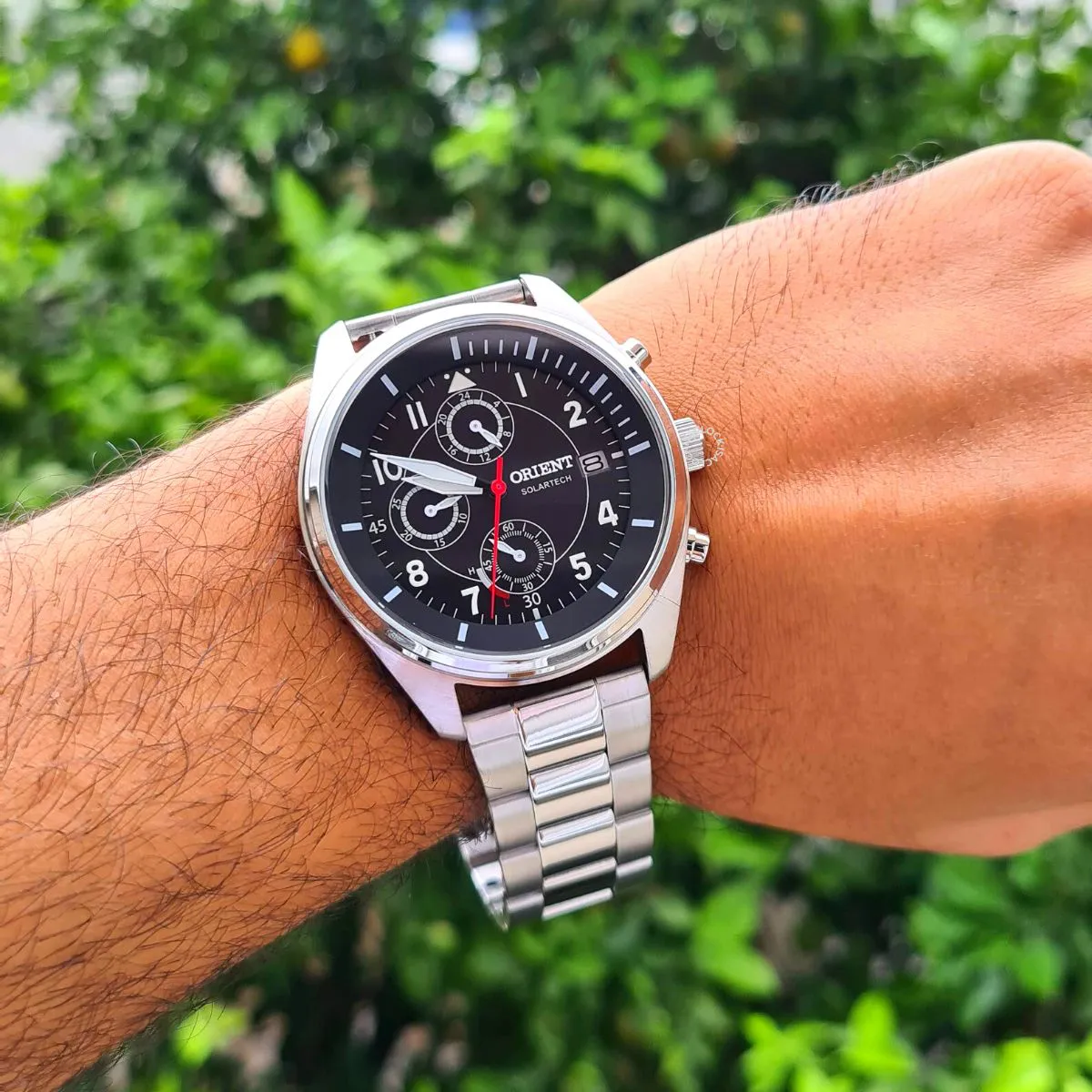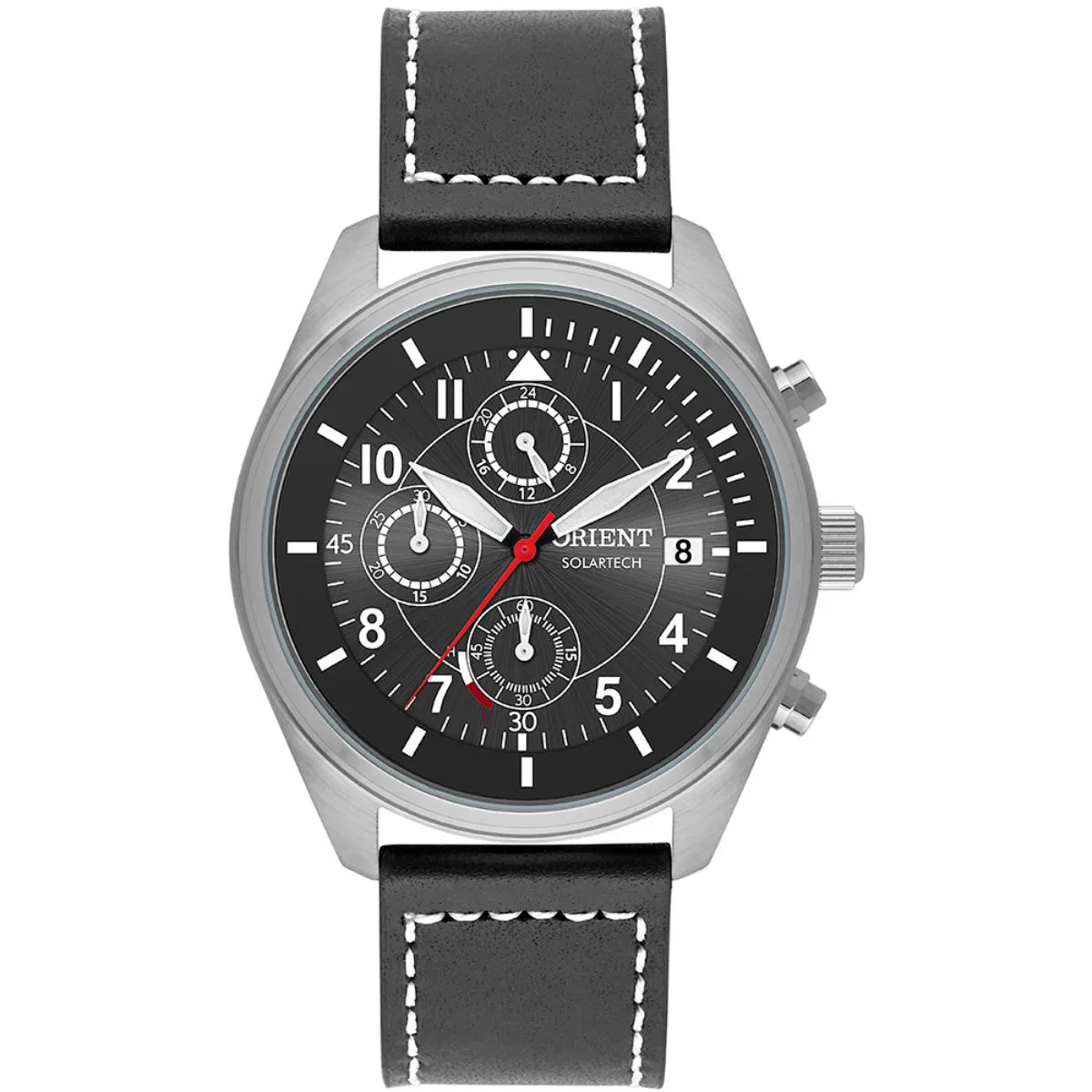RELOGIO PULSO ORIENT SOLARTECH - MBSSC249 - P2SX Relogio Orient Prateado Solar Tech Masculino. Produto Original com nota fiscal e Garantia. Envio rápido. Troca Pulseira de em couro e Prateado em Aço inoxidável. Cronógrafo Gênero: Masculino Visor: em camadas. preto Vidro: Cristal mineral Funções: autonomia aproximada de 4 meses, solar, calendário, modelos dotado com o quick release system que dispensa uso de ferramentas para trocas das pulseiras Pressão: 100m Características: com caixa em aço e pulseira uma em aço e uma em couro Diâmetro da caixa: 45 mm tamanho considerável padrão de acordo com os modelos convencionais, confira os detalhes nas fotos. Aproveite e faça sua compra, se presenteiei ou a quem você ama. ACOMPANHA: Garantia de 12 meses do Fabricante Embalagem Original Manual de Instruções Produto 100% Original.